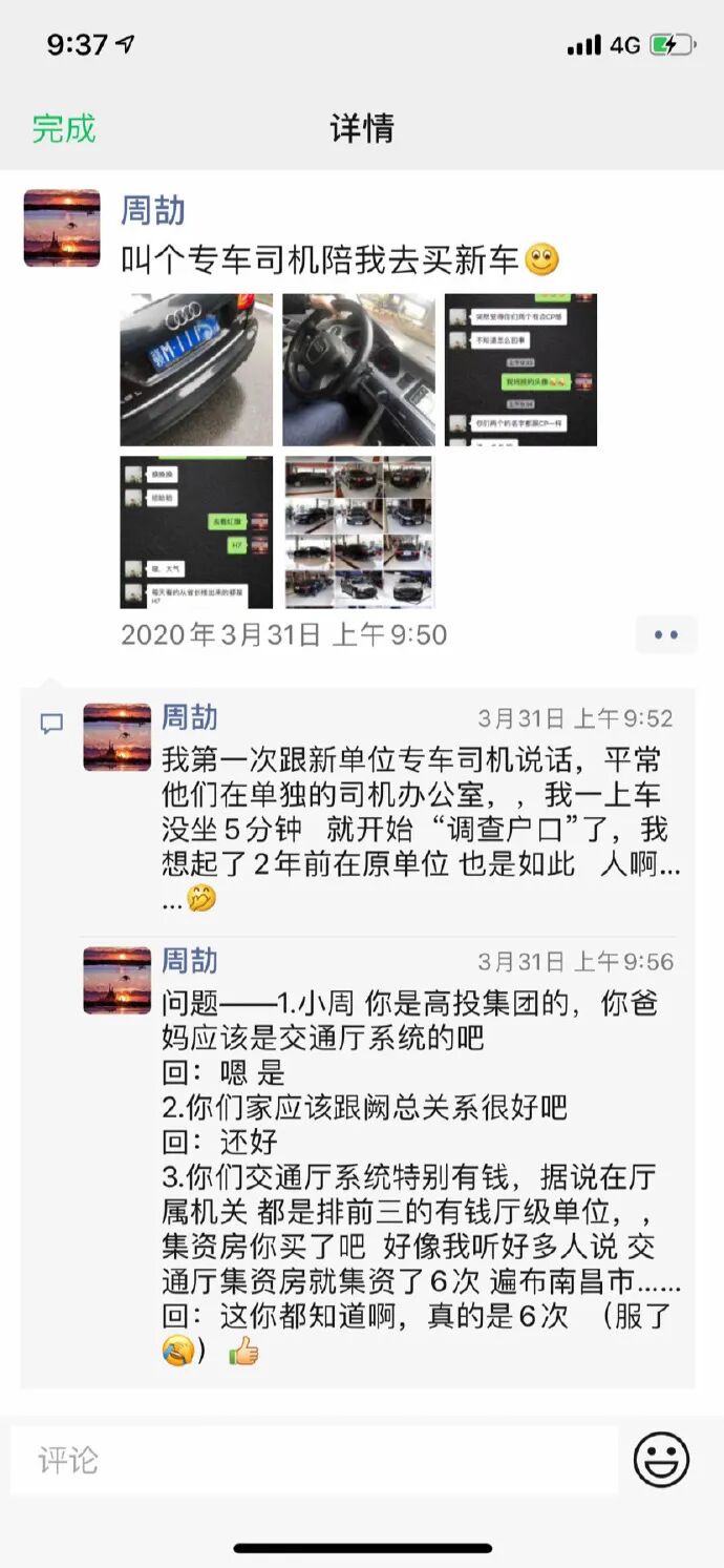 他说上班遇到个好基友,这位基友也是公职人员,白天开凯美瑞装穷,晚上开X5,而且周劼这孩子还附上了基友的车辆照片和基友的头像——还能怎么说呢,只能祝周劼的这位好基友工作顺利,平平安安了。