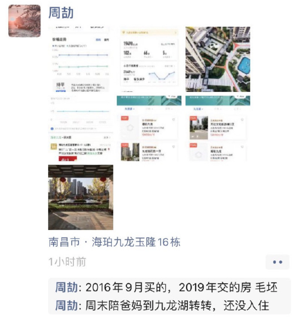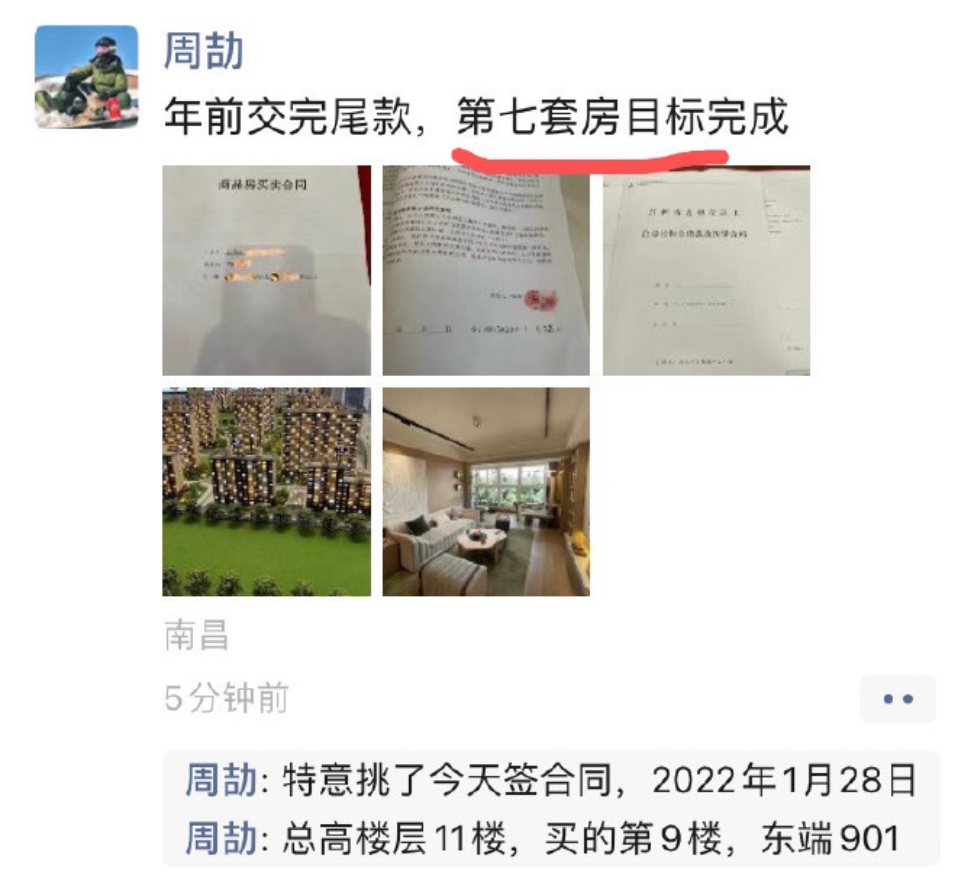 例如江西国控说周劼家只有6套房,但是周劼又在朋友圈说自己已经买了第七套房了: