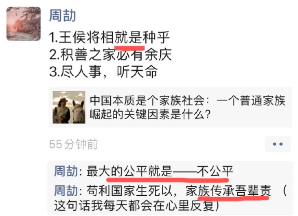 “王侯将相就是有种!”“最大的公平就是不公平!”多么牛叉的话,多么成熟的话,多么有哲理的话,周劼同学,真是太6了有木有?
