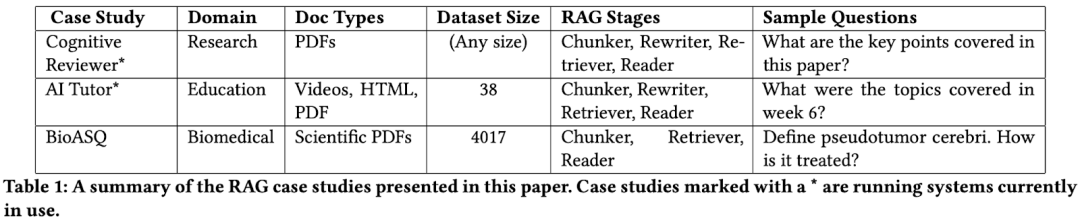 作者进行了三个案例分析,以探索实施 RAG 系统时面对的挑战。三个案例对应的总结如下图 Table 1 所示,其中 BioASQ 案例相关的所有脚本、数据和每个故障点的示例都可以在线获取(Data for: Seven Failure Points When Engineering a Retrieval Augmented Generation System):