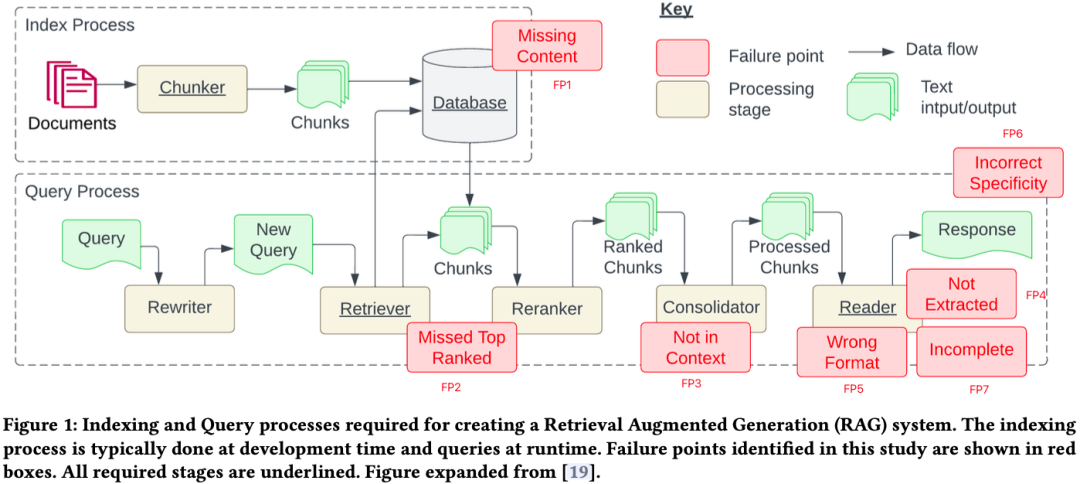 如下图 Figure 1 所示,作者通过以上的三个案例,总结了 RAG 系统的 7 个故障点。