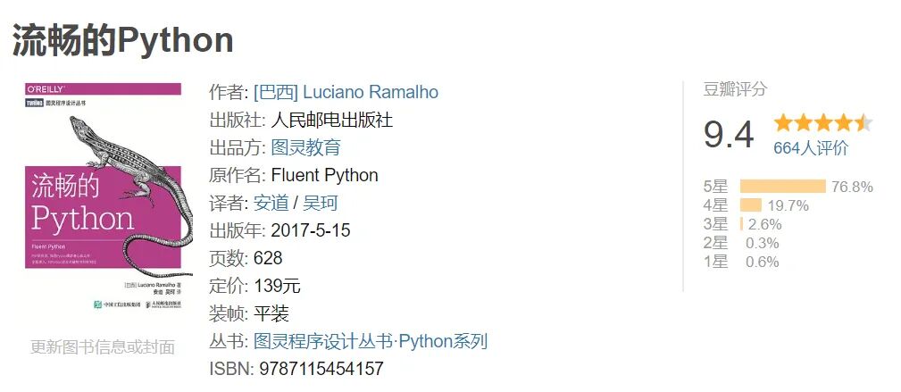 这本书的英文名是《Fluent Python》,在 2015 年 8 月出版。两年后,国内的图灵教育出品了译本,出版时间是 2017 年 5 月,获得豆瓣 9.4 高分。(图书翻译/出版真是个漫长的过程啊)