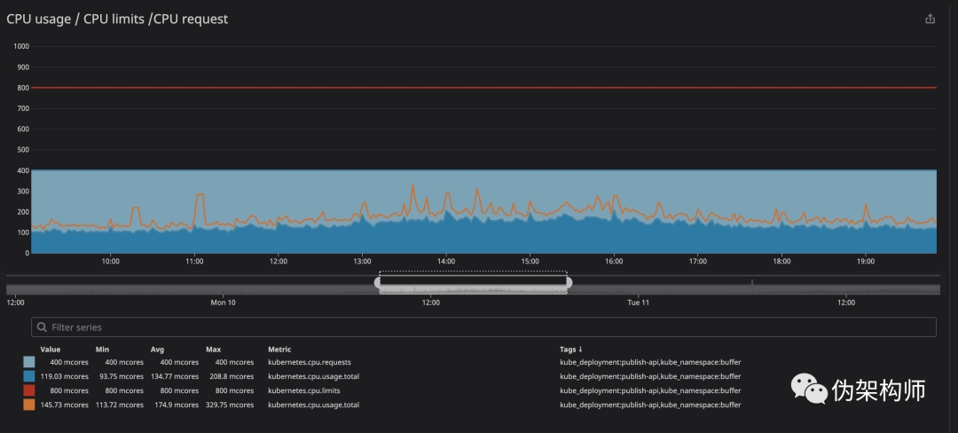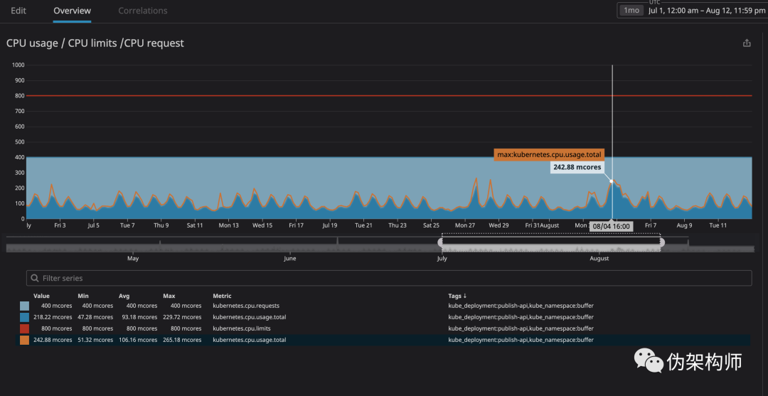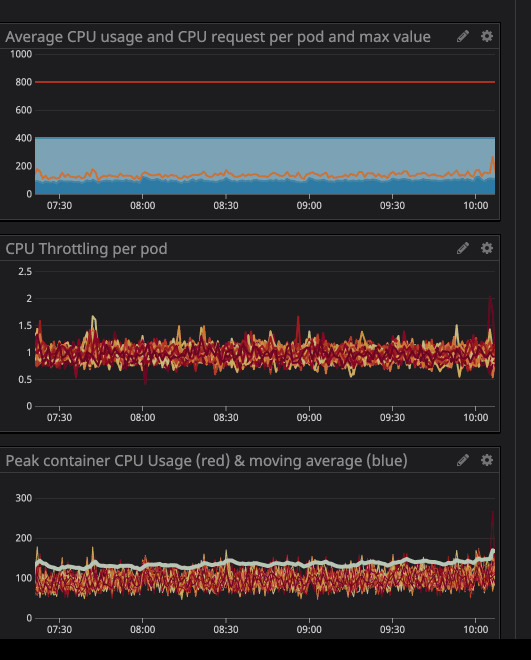 我们最担心的事情就是服务占用太多资源导致节点不可用。然而我们使用 Datadog 让集群变得易于监控,我们花了几个月的时间,对每个我们希望放开限制的服务的运行情况进行观察,根据监控结果,我们将这些容器的 CPU 请求值设置为观测到的上限的 120%。这样就保障了容器的资源需求。