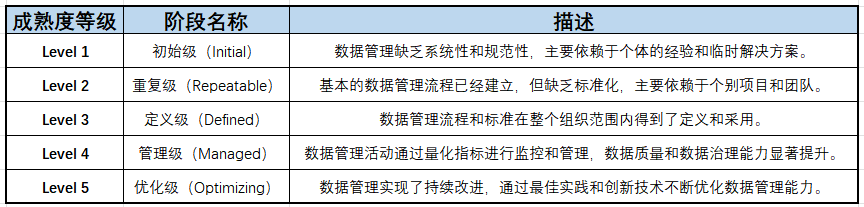 DCMM通常分为多个成熟度等级(通常为5级),每个等级对应数据管理能力的不同阶段: