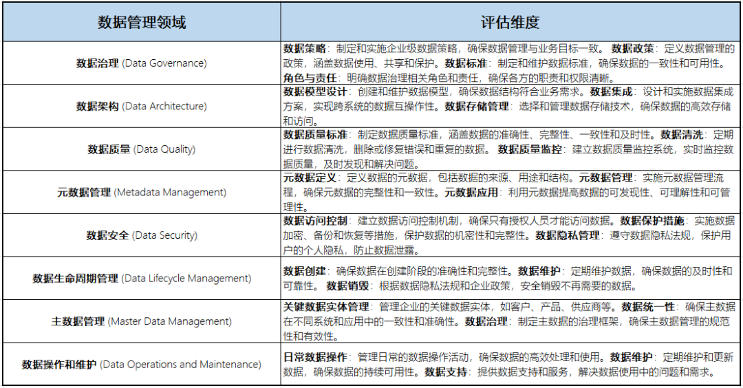 DCMM通常涵盖以下关键数据管理领域,每个领域包括若干评估维度: