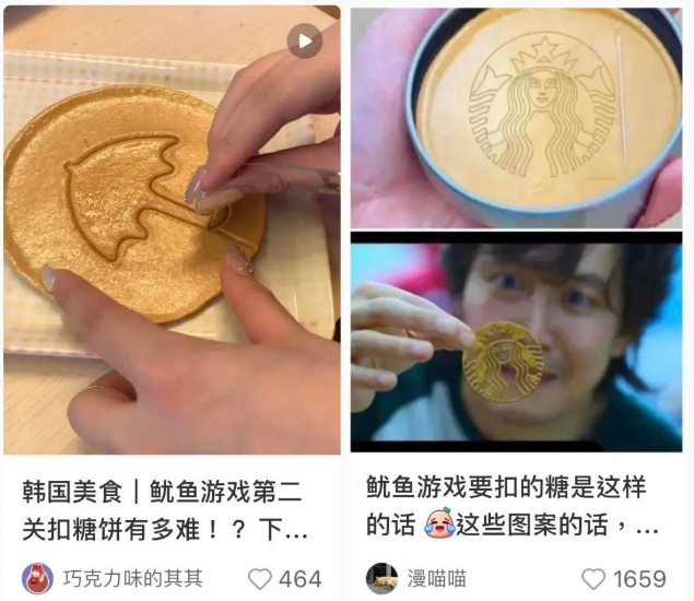 而在剧外,《鱿鱼游戏》里的123木头人、扣椪糖、打弹珠等民间小游戏也带火了一大波游戏周边和道具。#假如鱿鱼游戏里椪糖在中国#冲上热搜,小红书还卷起了一波自制椪糖的风潮,有900多篇笔记。自称鱿鱼游戏后遗症资深患者的玲玲,给「电商在线」展示了自己扣椪糖第九次失败的照片,自嘲“456亿注定和我无关。”