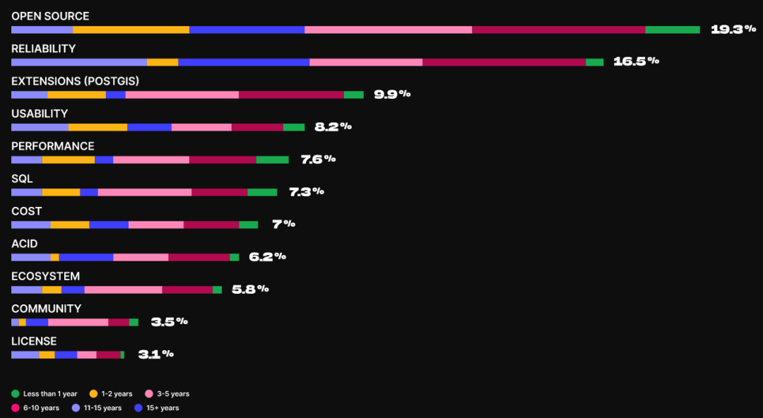 开源是大众选择 PostgreSQL 的第一大理由(19.3%),其次是可靠性(16.5%)和扩展(9.9%)。报告指出,选择 PostgreSQL 的原因随着经验的增长而变化。就使用 PostgreSQL 还未满 5 年的人来说,开源是他们选择 PostgreSQL 的最重要因素;对于那些使用了 PostgreSQL 6-10 年的人来说,可靠性和开源都很重要;使用 PostgreSQL 达 11-15 年的人选择 PostgreSQL 则主要是因为它的可靠性。