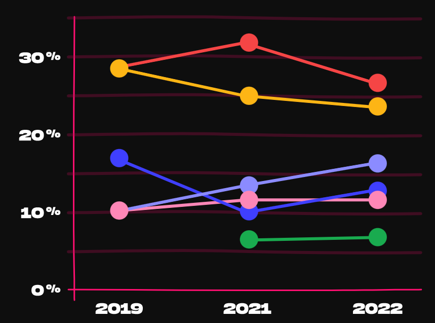 与 2019 年和 2021 年相比,表示会自行管理 PostgreSQL 数据库的受访者越来越少。似乎 PostgreSQL 用户开始越来越多地使用 DBaaS 供应商来部署 PostgreSQL。在将 PostgreSQL 部署为 Kubernetes 容器的人中,44% 使用 Helm,16% 使用 Crunchy Operator,7% 使用 Zalando Operator。