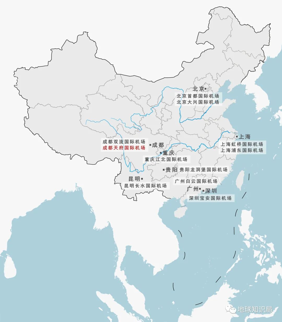 毕竟在天府机场出现之前,西南地区一直没有一个能够辐射四省市、拥有多条国内和国际航线的大机场。贵州的机场规模太小;云南昆明的长水机场主要面向东南亚;相对影响力较大的只有成都双流机场和重庆江北机场。