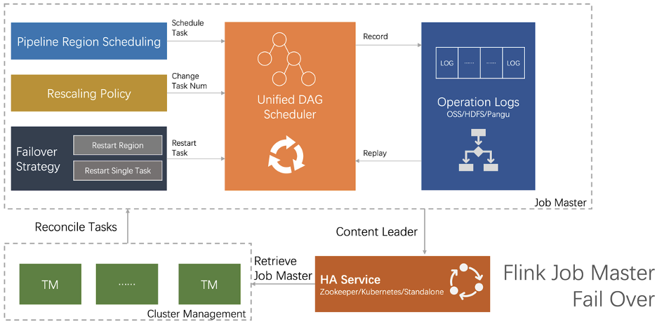 JM 是一个作业的控制中心,包含了作业的各种执行状态。Flink 利用这些状态对任务进行调度和部署。一旦 JM 发生错误之后,这些状态将会全部丢失。如果没有这些信息,即便所有的工作节点都没有发生故障,新 JM 仍然无法继续调度原来的作业。例如,由于任务的结束信息都已丢失,一个任务结束之后,新 JM 无法判断现有的状态是否满足调度下游任务的条件——所有的输入数据都已经产生。 从上边的分析可以看出,JM Failover 的关键就是如何让一个 JM“恢复记忆”。在 VVR[12] 中我们通过基于 Operation Log 机制恢复 JM 的关键状态。 细心的同学可能已经发现了,虽然这两个改进的出发点是为了批的场景,但是实际上对于流的作业容也同样有效。上边只是简要的介绍了两种容错策略的思路,实际上还有很多值得思考的内容。例如 Blocking 上游数据丢失了我们应该如何处理?JM 中有哪些关键的状态需要恢复?