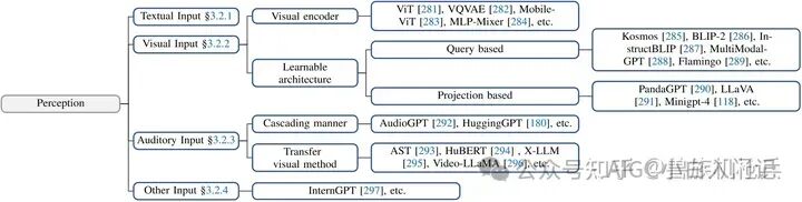 视频输入由一系列连续的图像帧组成。因此,Agent用于感知图像的方法可能适用于视频领域,使Agent也能很好地感知视频输入。与图像信息相比,视频信息增加了一个时间维度。因此,Agent对不同帧间时间关系的理解对于感知视频信息至关重要。一些工作,如 Flamingo ,通过使用掩码机制来确保理解视频时的时间顺序。掩码机制限制了Agent的视角,当它感知到视频中的特定帧时,只能从时间上较早的帧中获取视觉信息。