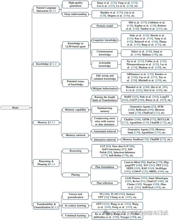 运行机制:为确保有效交流,自然语言交互能力(3.1.1)至关重要。在接收感知模块处理的信息后,大脑模块首先转向存储,在知识中检索(3.1.2)并从记忆中回忆(3.1.3)。这些结果有助于Agent制定计划、进行推理和做出明智的决定(3.1.4)。此外,大脑模块还能以摘要、矢量或其他数据结构的形式记忆Agent过去的观察、思考和行动。同时,它还可以更新常识和领域知识等知识,以备将来使用。LLM-based Agent还可以利用其固有的概括和迁移能力来适应陌生场景(3.1.5)。在随后的章节中将详细探讨图2所示的大脑模块的这些非凡功能。
