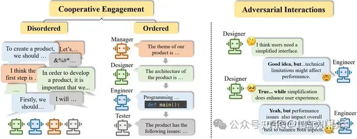 消极的群体行为会破坏Agent群体的有效性和一致性。Agent之间的激烈辩论或争执所产生的冲突和分歧可能会导致内部关系紧张。此外,最近的研究表明,Agent可能会表现出对抗行为,甚至采取破坏行为,例如为了追求自己的效率或目标而破坏其他Agent或环境。