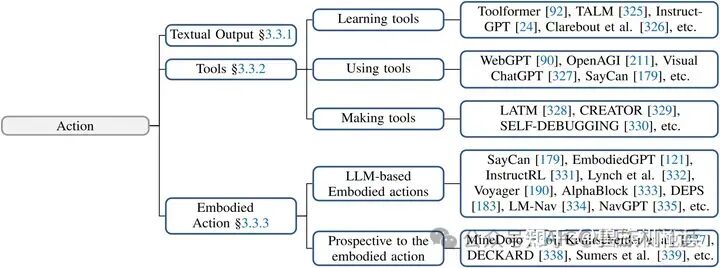 人类在感知环境后,大脑会对感知到的信息进行整合、分析和推理,并做出决策。随后,他们利用神经系统控制自己的身体,做出适应环境或创造性的行动,如交谈、躲避障碍或生火。当一个Agent拥有类似大脑的结构,具备知识、记忆、推理、规划和概括能力以及多模态感知能力时,它也有望拥有类似人类的各种行动来应对周围环境。在Agent的构建过程中,行动模块接收大脑模块发送的行动序列,并执行与环境互动的行动。
