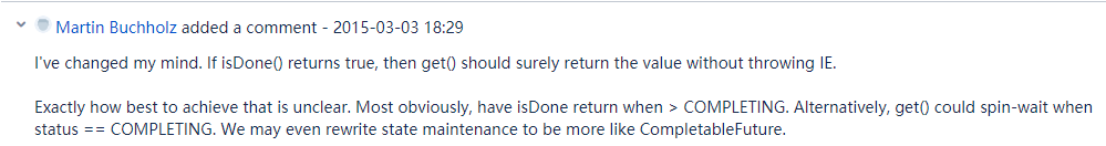 现在他的主意是:如果 isDone 方法返回了 true,那么 get 方法应该明确的返回结果值,而不会抛出 IE 异常。