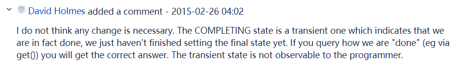 COMPLETING 状态是一个转瞬即逝的过渡状态,它代表我们已经有最终状态了,但是在设置最终状态开始和结束的时间间隙内有一个瞬间状态,它就是 COMPLETING 状态。