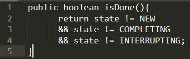 按照这个逻辑,那么判断任务是否完成(isDone)的时候,也不需要对 INTERRUPING 这个中间状态做特殊处理。