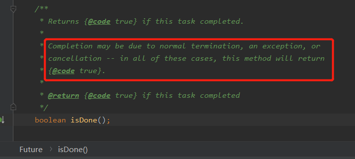描述上说:如果一个任务已完成,调用这个方法则返回true。而完成除了是正常完成外,还有可能是任务异常或者任务取消导致的完成,这些都算完成。