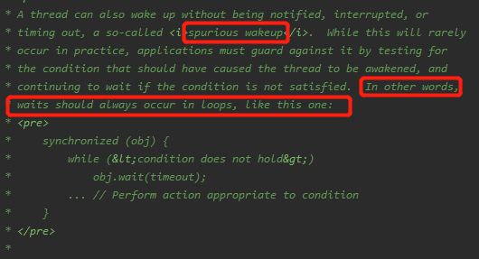 一个线程能在没有被通知、中断或超时的情况下唤醒,也即所谓的“虚假唤醒”,虽然这点在实践中很少发生,但是程序应该循环检测导致线程唤醒的条件,并在条件不满足的情况下继续等待,来防止虚假唤醒。