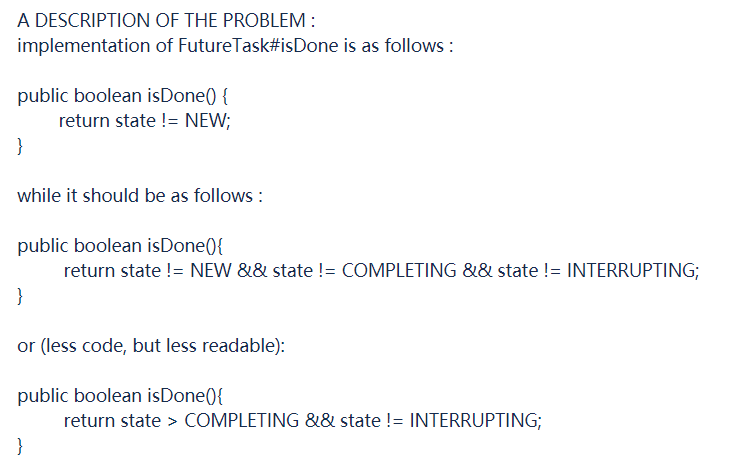 FutureTask.isDone 方法在任务还没有完成的时候,比如还是 COMPLETING 和 INTERRUPTING 的时候就会返回 true,这样是不对的。这就是 BUG。