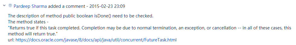 这个 BUG 说:FutureTask.isDone 方法在任务还没有完成的时候就会返回 true。