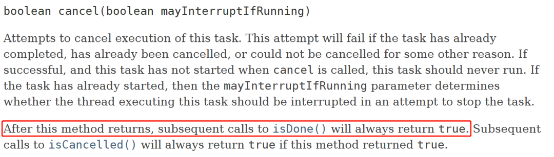 文档的方法说明上说:如果调用了 cancel 方法,那么再调用 isDone 将永远返回 true。