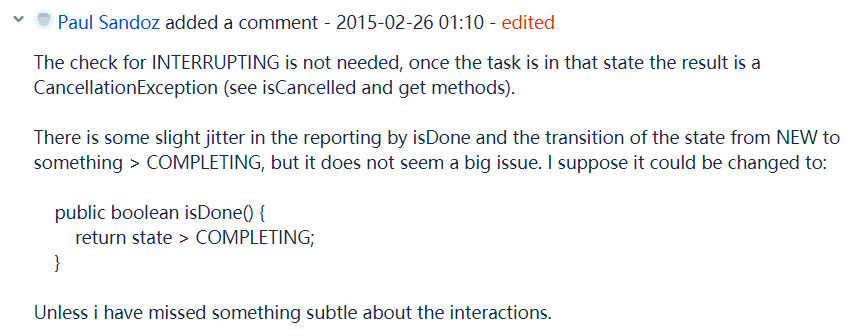 从“FutureTask.isDone 方法在任务还没有完成的时候就会返回 true”变成了“如果 isDone 方法返回了 true,那么 get 方法应该明确的返回结果值,而不会抛出 IE 异常”。
