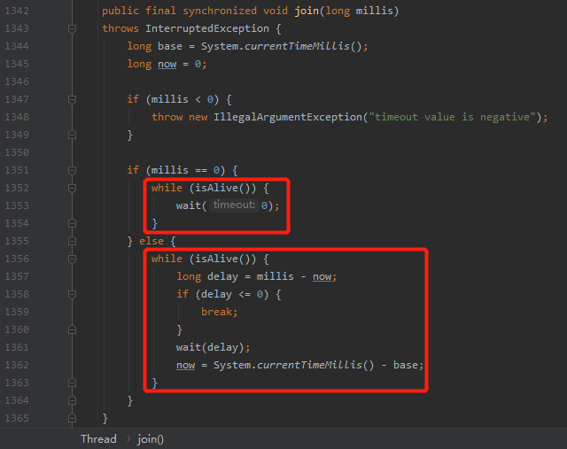 在 join 方法中,isAlive 方法就是这里的 condition does not hold。