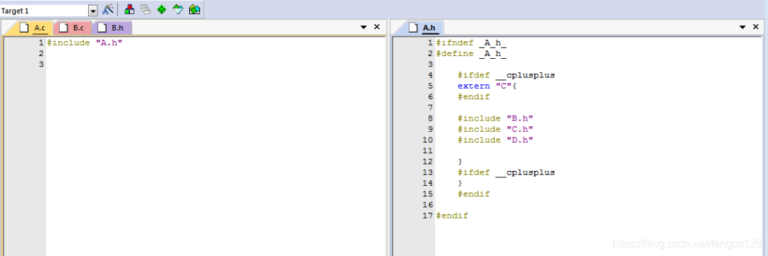 语言描述有时太抽象,还是符号举例说明下:假如有两个.c文件分别为A.c和B.c,自然它们都有各自的A.h和B.h文件。