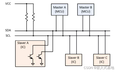 设备的SDA, SCL管脚采用OD门输出,不同设备间进行线与操作,即“与逻辑”。