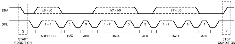 数据有效:数据传输时,SCL为高电平时,SDA的数据有效,即此时的SDA为高电平时表示数据“1”,为低电平时表示数据“0”;当SCL为低电平时,SDA的数据无效,一般在此时,对SDA进行电平切换。