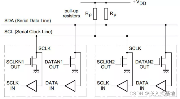 SDA和SCL需要外接上拉电阻,根据总线上的I2C设备数量,系统的通信速度,设计选择不同的上拉电阻。I2C设备数量决定了总线上母线电容的大小,母线电容和上拉电阻限制了系统的通信速率。