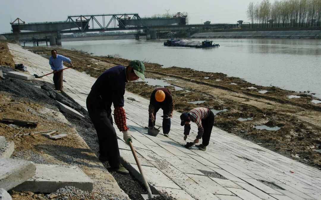 江苏扬州的水泥工在淮河入江水道江都段用水泥预制块铺设河道岸边护坡