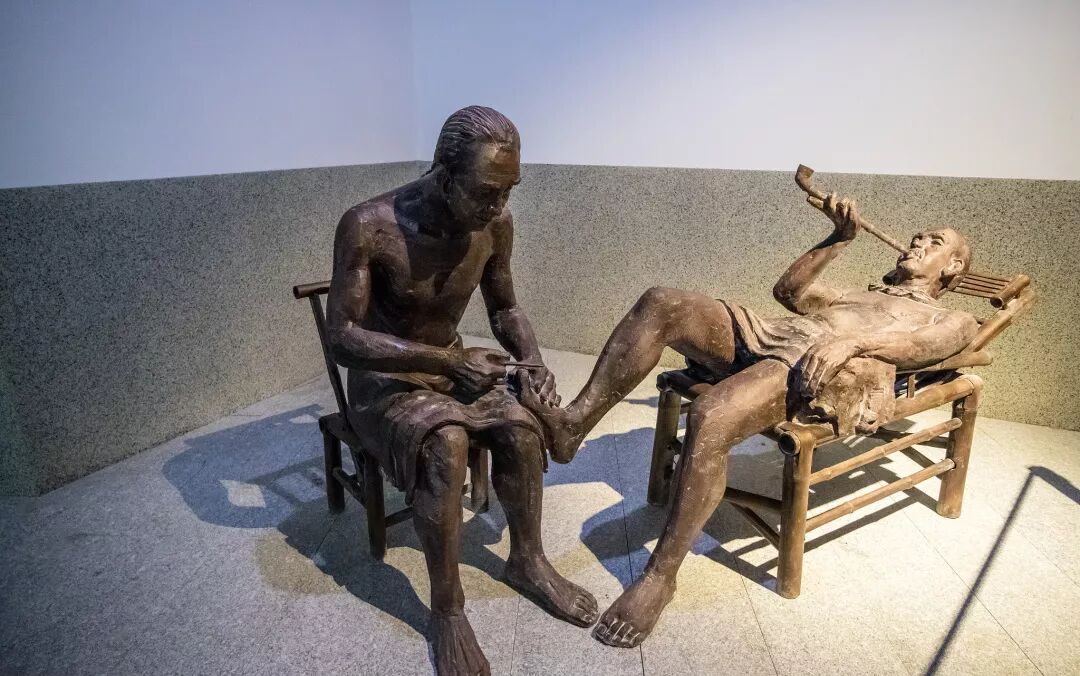 2015年05月14日,福建省福州市,温泉博物馆里再现德天泉澡堂泡澡客泡完澡躺在竹椅上修脚抽烟的场景