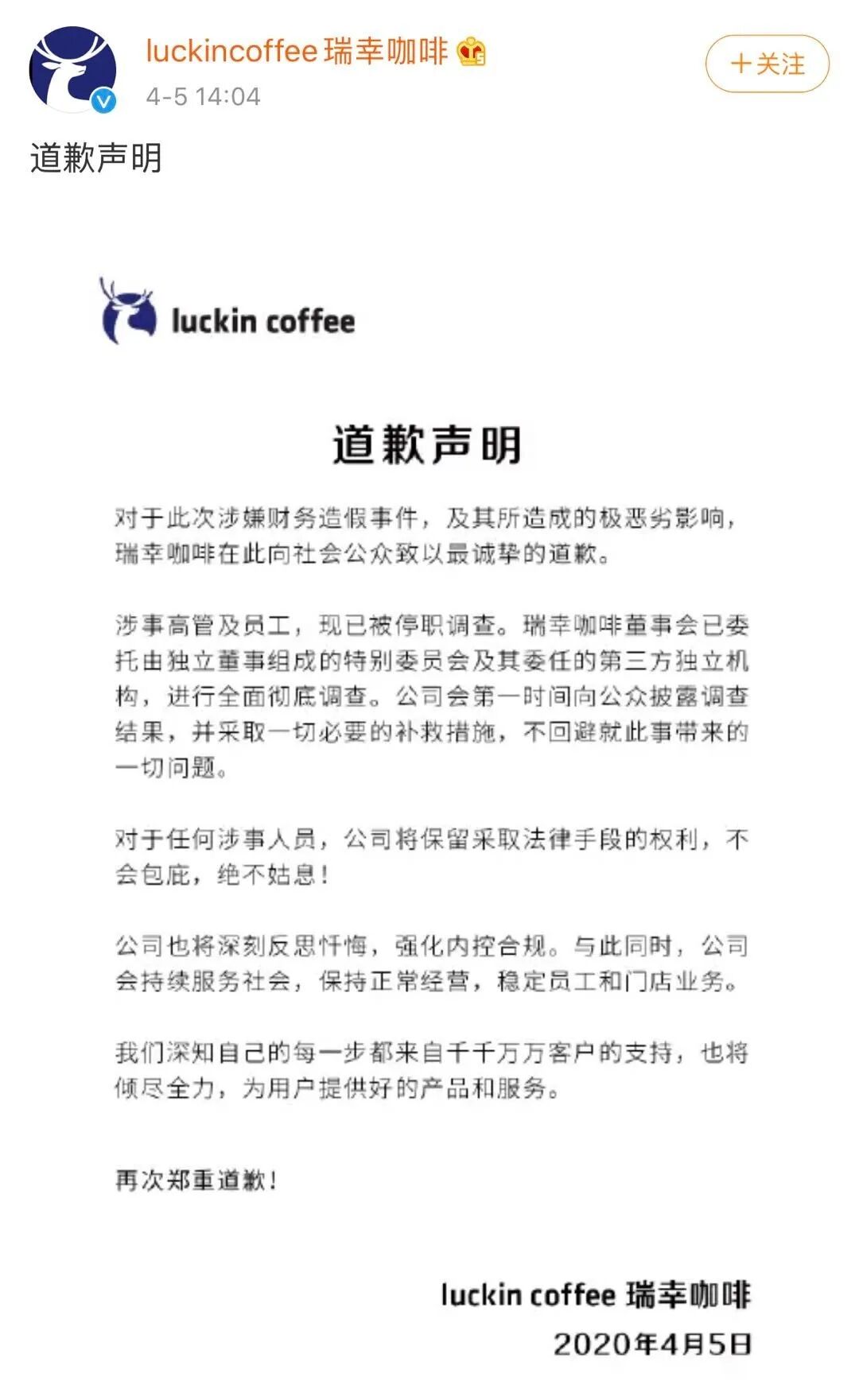 在董事长朋友圈致歉同日,瑞幸咖啡在官方微博发布一则道歉声明。