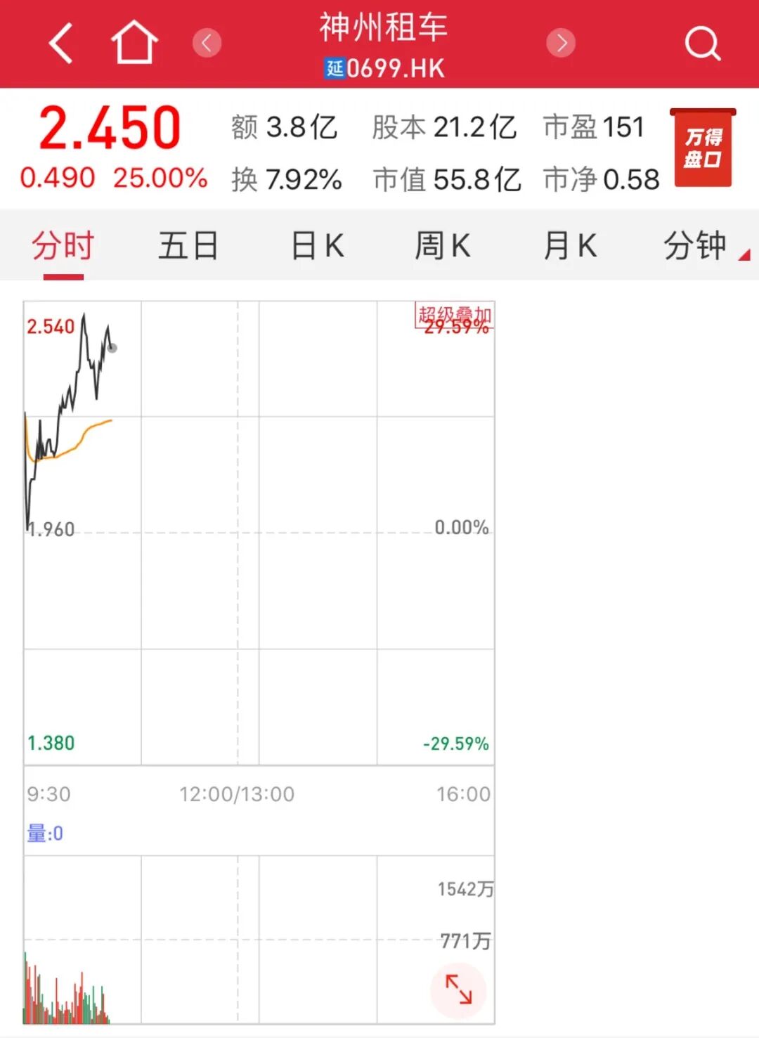 今日早盘,神州租车复牌大涨,截至发稿涨25%,报价2.45港元。