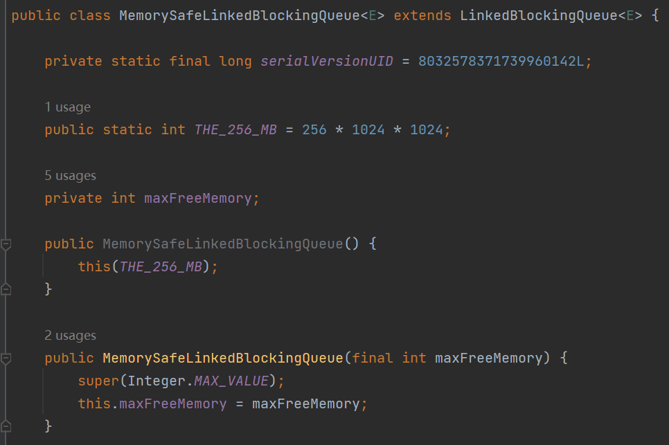 MemorySafeLBQ 还是继承自 LinkedBlockingQueue,只是多了一个自定义的成员变量,叫做 maxFreeMemory,初始值是 256 * 1024 * 1024。