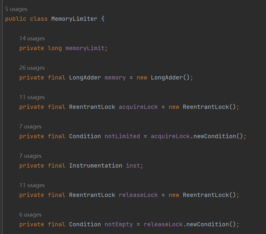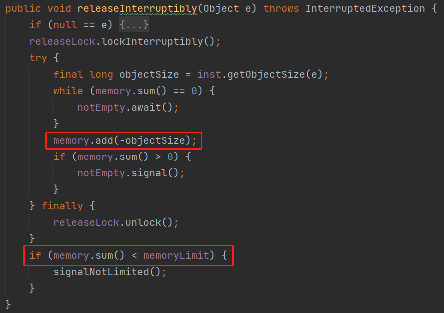 只是自定义了一个 memoryLimiter 的对象,然后每个核心方法里面都操作了 memoryLimiter 对象: