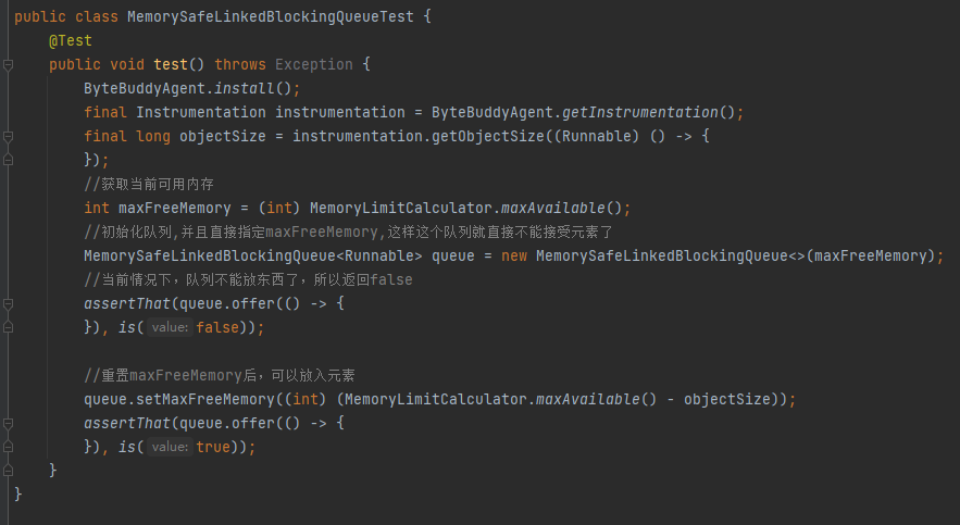 最后,再看看作者提供的 MemorySafeLBQ 测试用例,我补充了一点注释,很好理解,自己去品,不再多说: