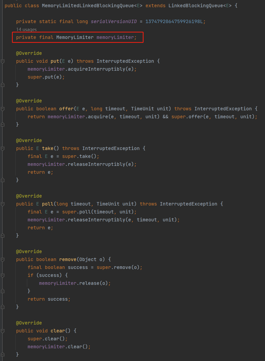 我先给你看看 MemoryLimitedLBQ 这个类,它就是继承自 LinkedBlockingQueue,然后重写了它的几个核心方法。