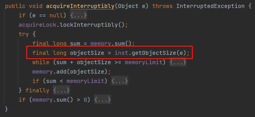 所以,理解了 inst.getObjectSize(e) 这行代码,我们再仔细看看 acquireInterruptibly 是怎么样的: