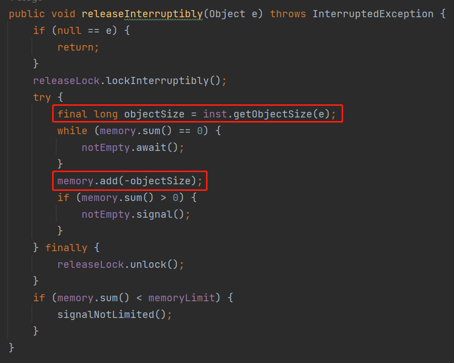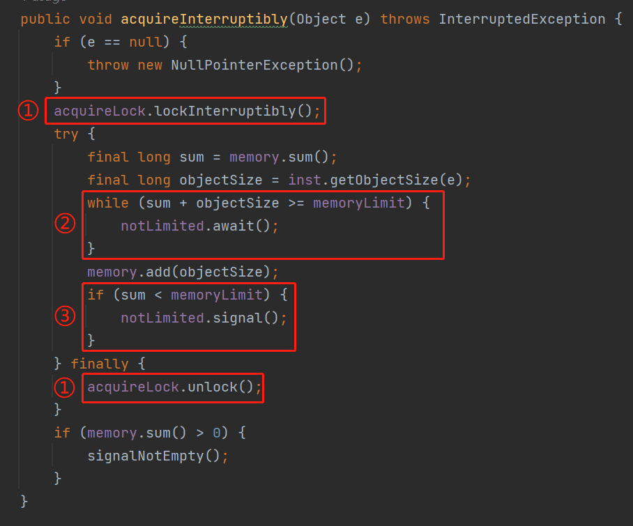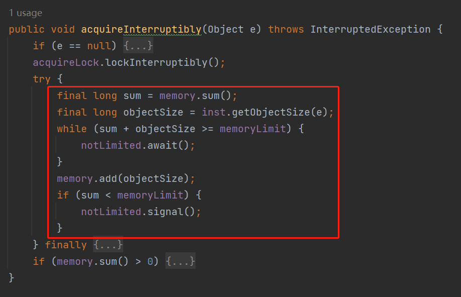 比如在 memoryLimiter 的 acquireInterruptibly 方法里面,它是这样的用的: