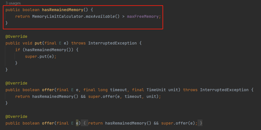 我看了,关键方法就是这个 hasRemainedMemory,在调用 put、offer 方法之前就要先调用这个方法: