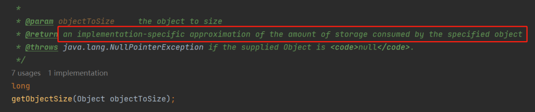 整句话翻译过来就是:返回指定对象所消耗的存储量的一个特定实现的近似值。