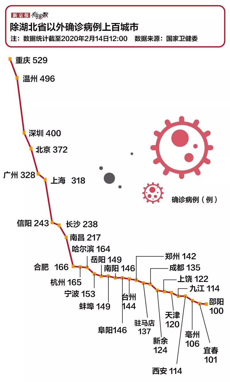 全国除了湖北省以外的城市确诊人群数量上百的已经有29个城市。