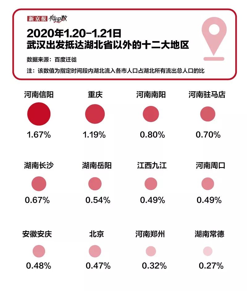 从百度迁徙数据来看,在春节前几天,从武汉出发抵达湖北省以外的十大地区里,河南信阳稳居第一位。
