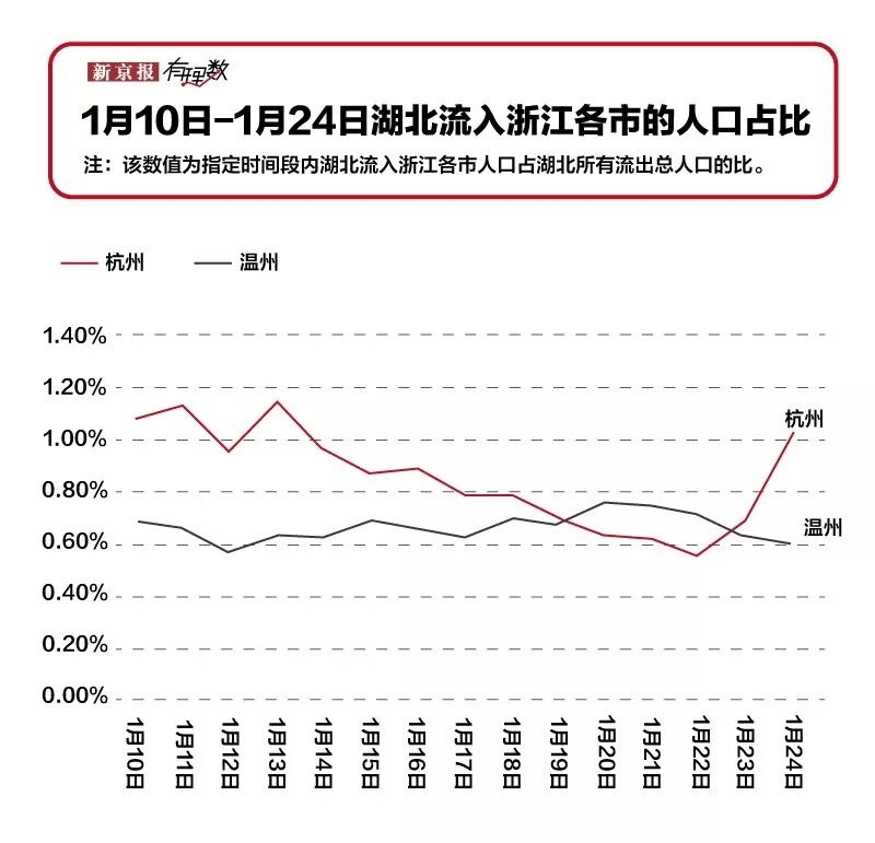 百度迁徙数据显示,1月19日1月23日,温州超过杭州,成为浙江省内湖北流出人口第一目的地。