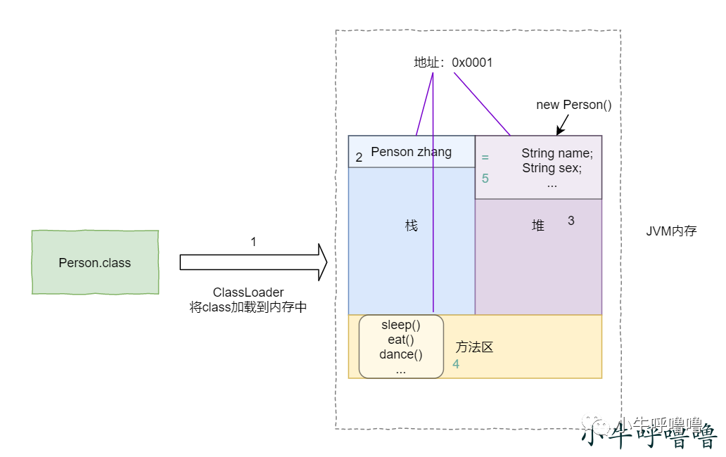 将硬盘上指定位置的Person.class文件加载进内存 执行main方法时,在栈内存中开辟了main方法的空间(压栈-进栈),然后在main方法的栈区分配了一个变量zhang。 执行new,在堆内存中开辟一个 实体类的 空间,分配了一个内存首地址值 调用该实体类对应的构造函数,进行初始化(如果没有构造函数,Java会补上一个默认构造函数)。 将实体类的 首地址赋值给zhang,变量zhang就引用了该实体。(指向了该对象)