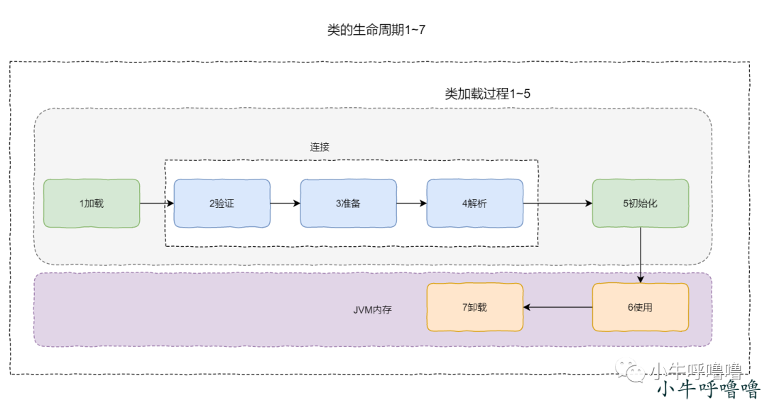 类的生命周期一般有如下图有7个阶段,其中阶段1-5为类加载过程,验证、准备、解析统称为连接