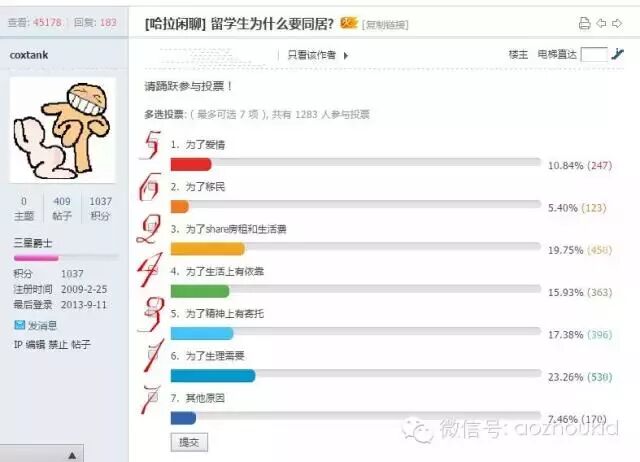 之前,滴答网论坛还专门做了“留学生为什么要同居”的调查。